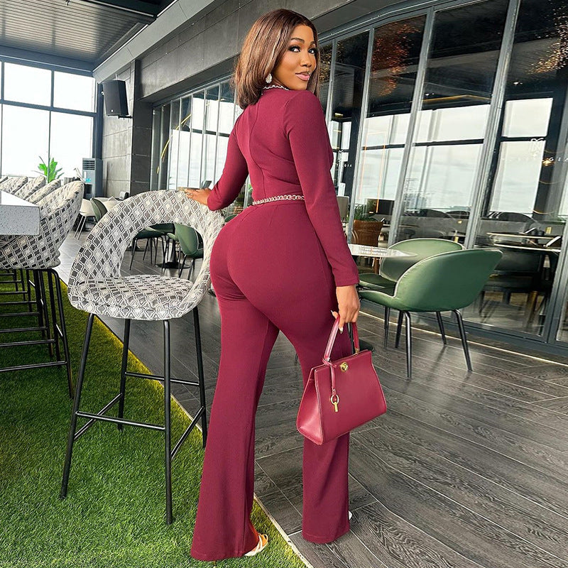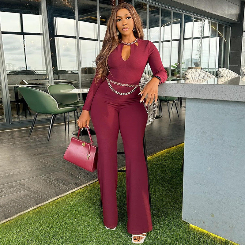 2024 Spring New Temperament Hollow Long Sleeve Slim High Waist Wide Leg Trousers Jumpsuit