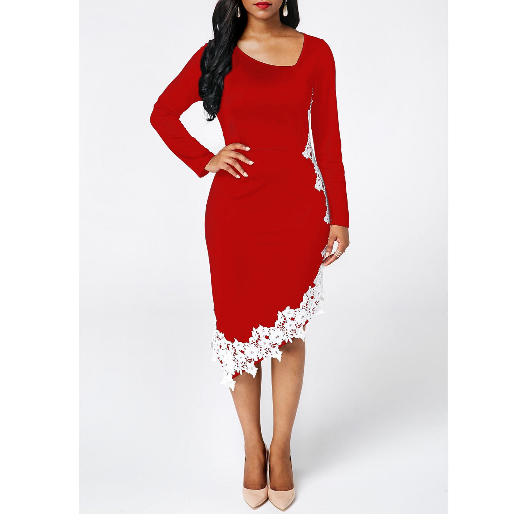 Hip Commuter Dress Diagonal Collar Lace Patchwork Color Contrast Irregular Hem Slim-Fit Women