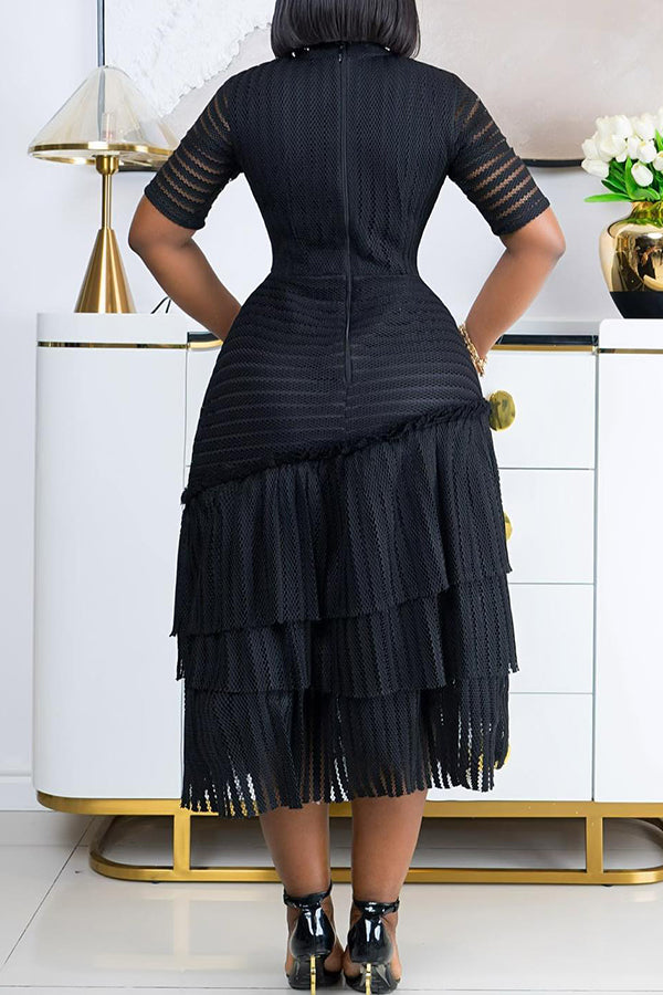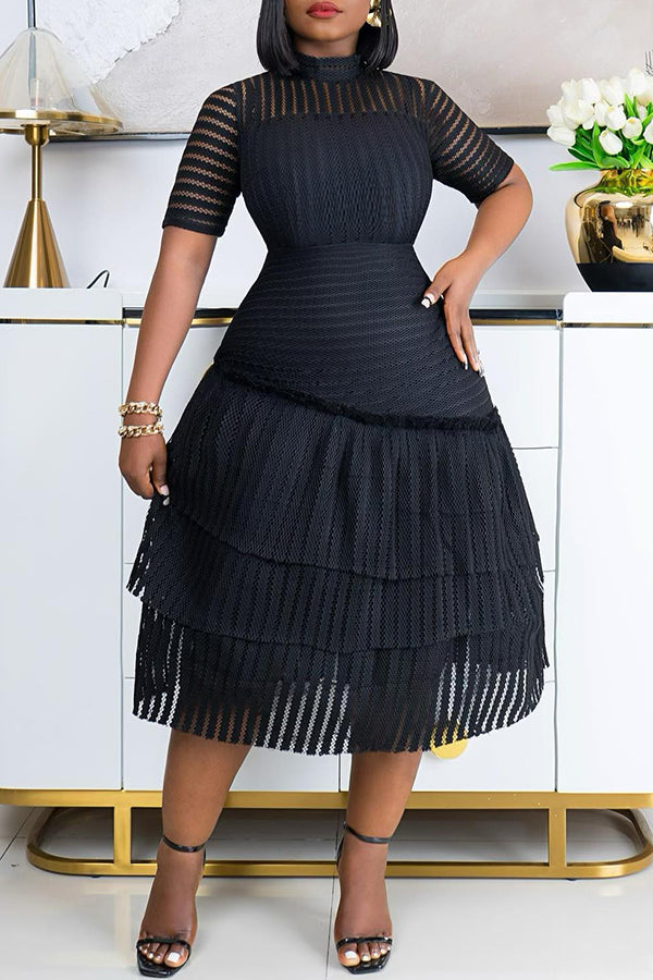 Fashionable Elegant Solid Color See-Through Striped A Hem Dress