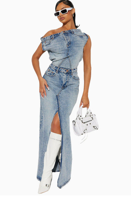 We're glad you've clicked on our new two piece set as we're really into its retro vibes! The oblique collar and sleeveless cut make this a great choice for any stylish girl.