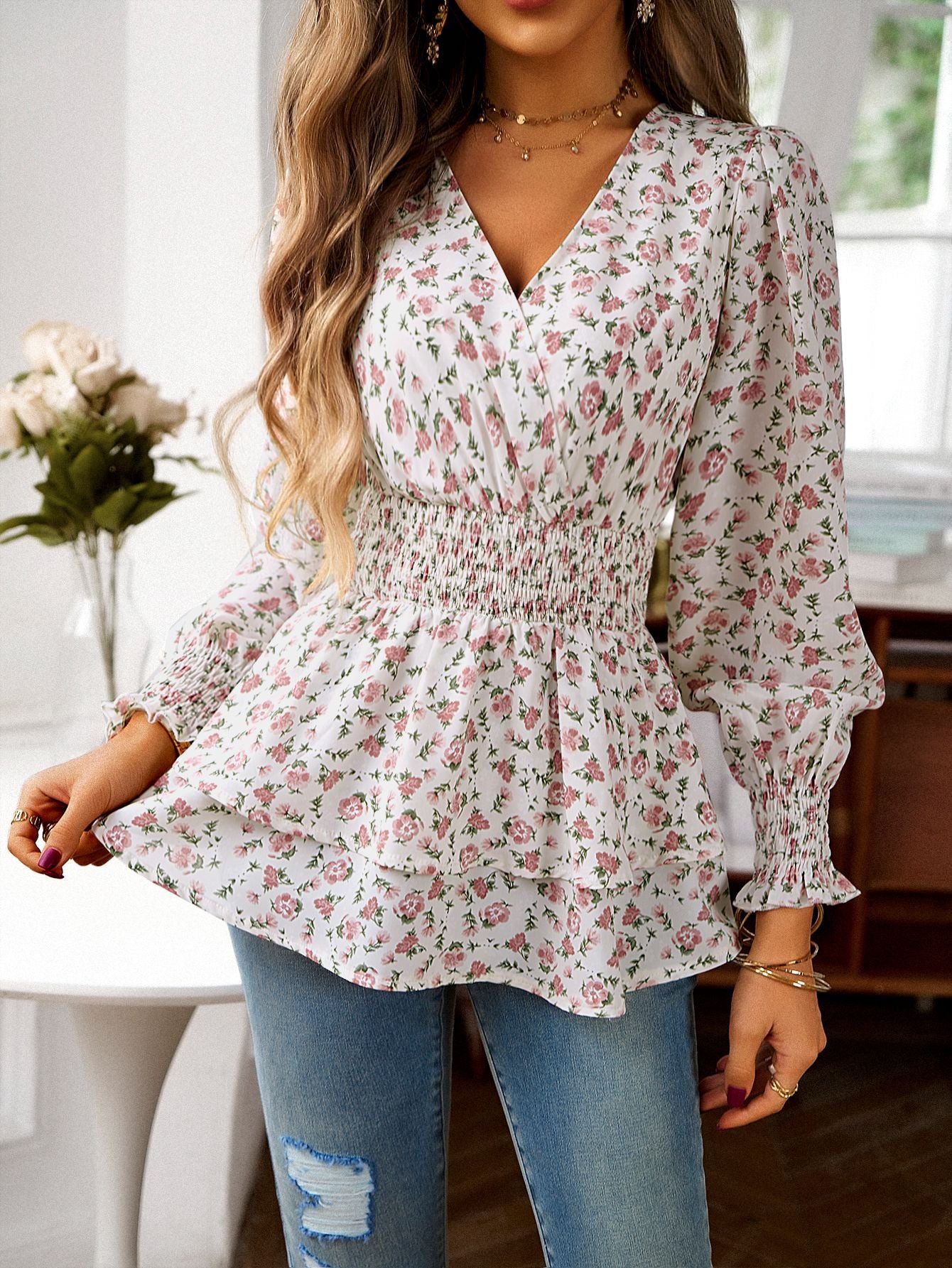 Ladies' Fashionable Printed V-Neck Long Sleeved Shirt