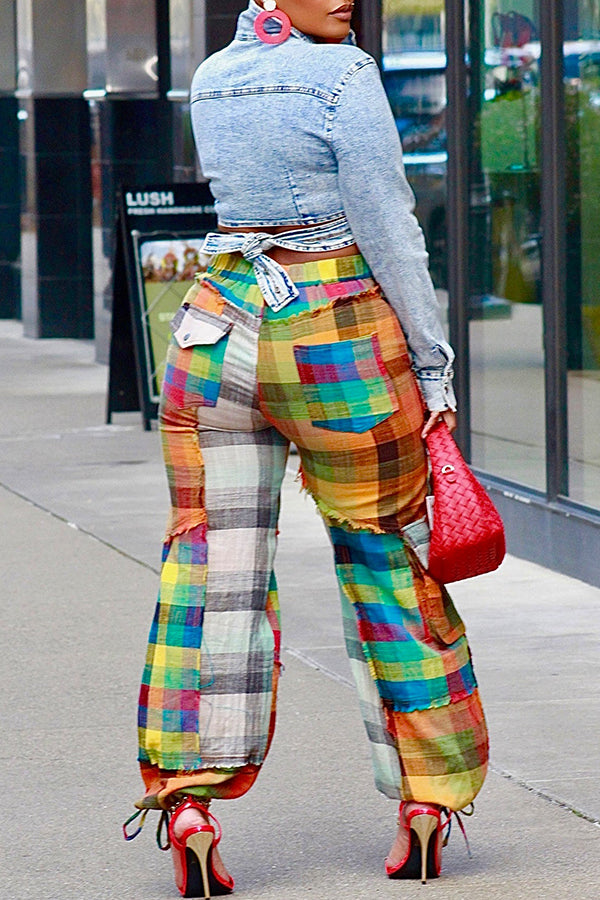 Casual Color Contrasting Plaid Stitching Raw Edge Lace-Up Straight Leg Pants