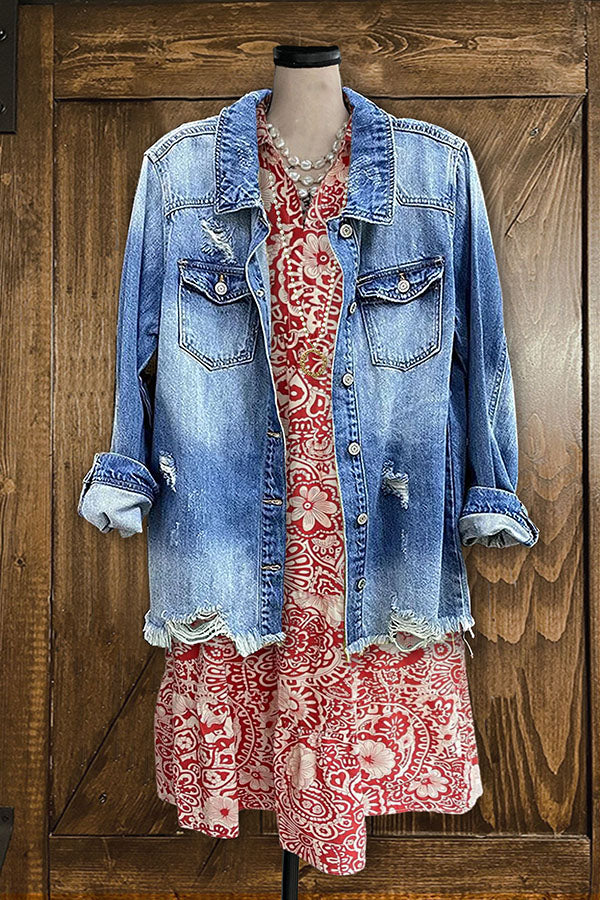 Vintage Flower Print V-neck Pleated Ruffle Dress